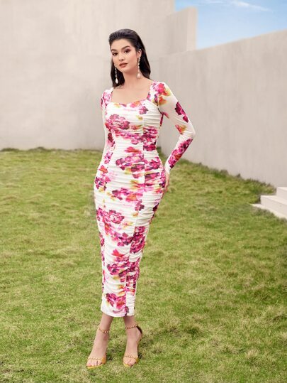 Modelyn Vestido ajustado con estampado floral fruncido de malla - Multicolor - Añade 1