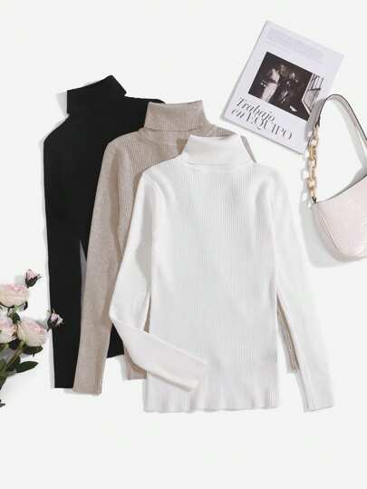 SHEIN Essnce 3 piezas Suéter de cuello alto de punto acanalado sólido para otoño/invierno - Multicolor - Añade 1