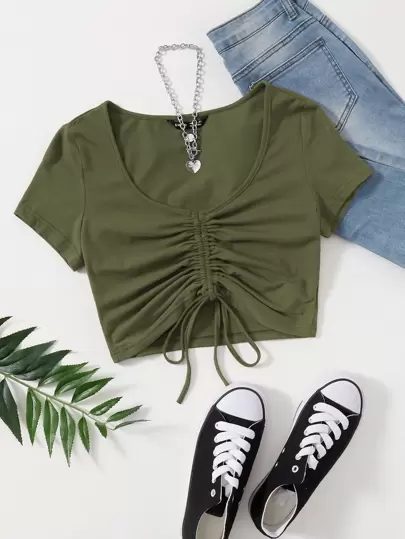 SHEIN EZwear Camiseta con fruncido con cordón unicolor - Verde militar - Añade 3