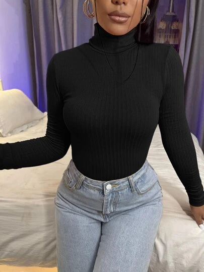 SHEIN Essnce Camiseta de cuello cisne tejida de canalé - Negro - Añade 5
