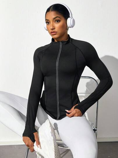 Easithlete Chaqueta deportiva ajustada con cierre de cremallera resistente al viento y con detalles reflectantes para yoga - Negro - Añade 3