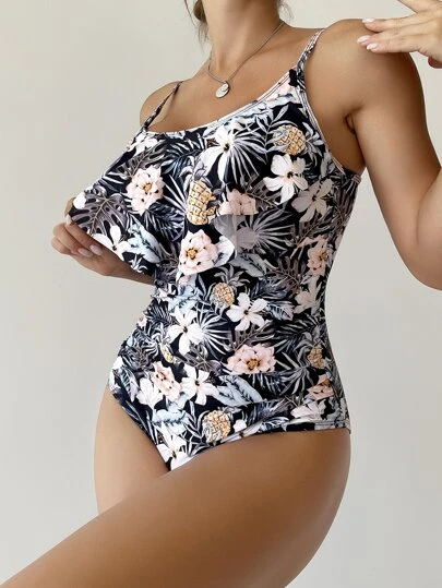SHEIN Swim Traje de baño de una pieza con estampado tropical y volantes - Multicolor - Añade 1