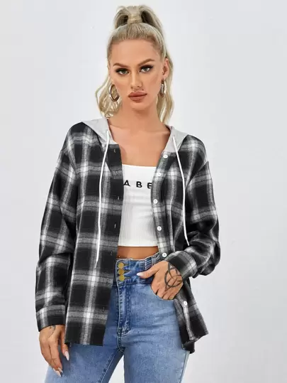 Muchica Abrigo Con Capucha Y Cordón De Tartán - Blanco y Negro - Añade 5