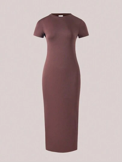 Sparklyn Vestido sencillo con manga corta y unicolor para chicas adolescentes, ideal para uso diario - Café integral - Añade 1