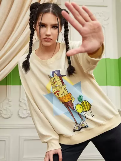 El Rincon Sudadera de hombros caídos con estampado de dibujos animados - Beis - Añade 5