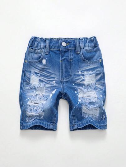 SHEIN Explorewe Pantalones Cortos De Mezclilla Rasgados Y De Lavado Claro Para Niños Jóvenes, Diseño De Moda - Lavado ligero - Añade 8