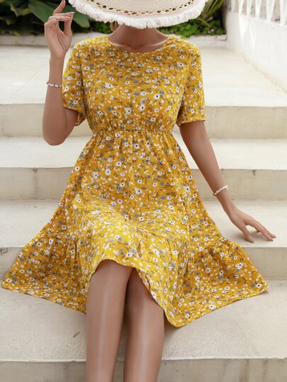 SHEIN Maternidad Vestido floral bajo con fruncido - Mostaza Amarilla - Añade 5