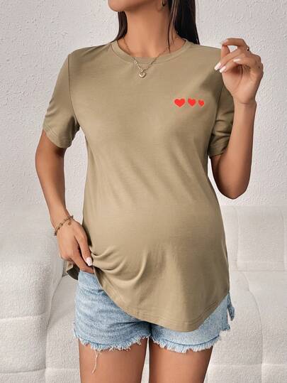 SHEIN Maternidad Camiseta con estampado de corazón - Caqui - Añade 5
