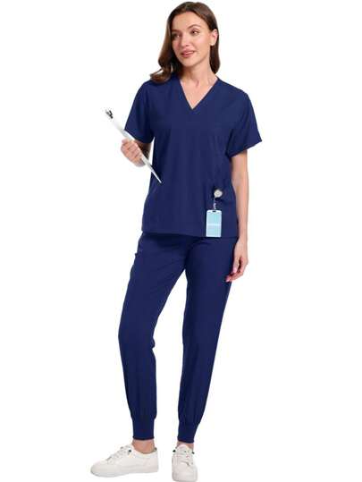 Conjunto De Uniforme Clínico Quirúrgico De Dos Piezas Con Manga Corta, Cuello En V y Bolsillos Funcionales Para Uso Profesional En Tela De Poliéster y Spandex - Azul Marino - Añade 1