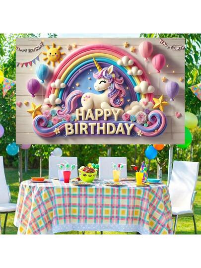 1 pieza Pancarta de fondo con diseño de unicornio arcoíris estéreo y estilo de cumpleaños - Tamaños: 210*150/150*100/100*75cm - Decoración de poliéster con patrón de madera, sol, estrellas, globos, unicornio arcoíris, ideal para fiestas de cumpleaños, celebraciones al aire  decoración del hogar y el jardín - Multicolor - Añade 9