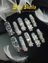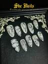 Kit de uñas acrílicas She Nails, estilo gótico barroco punk rock occidental DIY, 10 piezas de uñas metálicas brillantes de media y larga longitud con forma de almendra, hechas a mano para presionar, en azul, plateado, con ondas, hexagramas, lunas, estrellas, totem, círculos y cuentas de plata 3D, adecuadas para mujeres y hombres, niñas y niños, para fiestas o uso diario, con pegatinas de gel, lima de uñas y suministros de uñas incluidos.