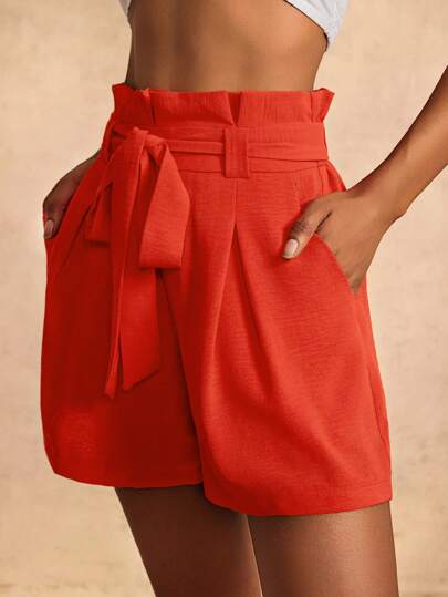 Slaydiva Nuevos Shorts casuales naranja con cinturón y bolsillos laterales, simples y versátiles, para primavera/verano - Naranja - Añade 5