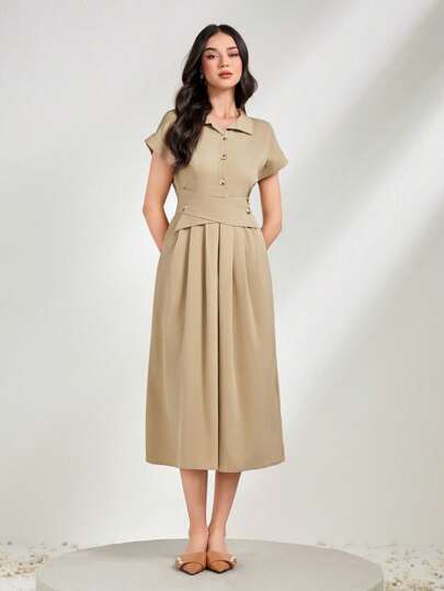 Mulvari Vestido camisero unicolor con botón delantero con diseño de fruncido - Caqui - Añade 4