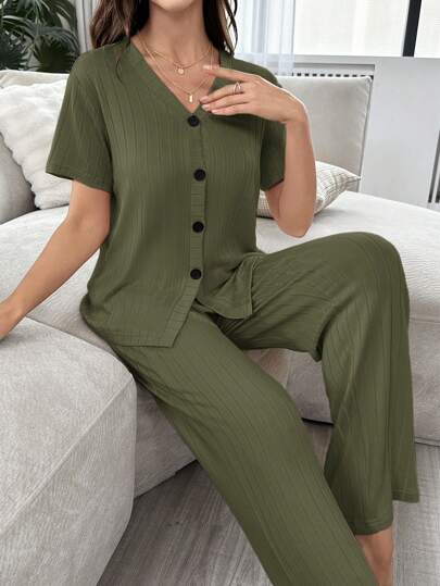 Conjunto de ropa de hogar con top de manga corta y cuello abierto en unicolor y pantalones largos - Verde militar - Añade 1
