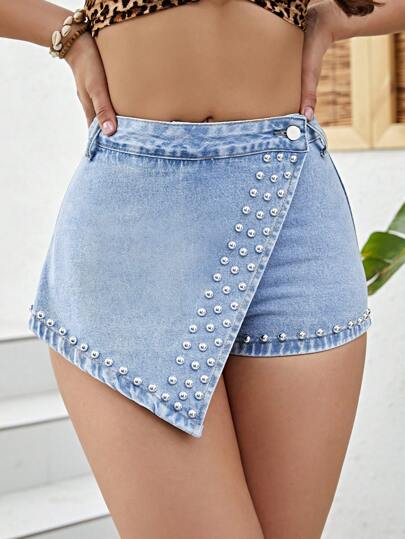 SHEIN Essnce Skort mezclilla con diseño de tachuela cruzado - Lavado ligero - Añade 6