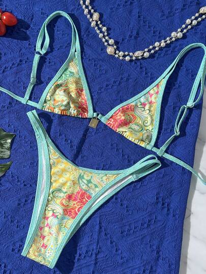 Conjunto de bikini con estampado de verano y cuello de halter para mujer - Multicolor - Añade 3