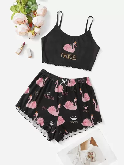 Conjunto de pijama de tirantes cisne & con estampado de letra ribete en forma de lechuga - Negro - Añade 4