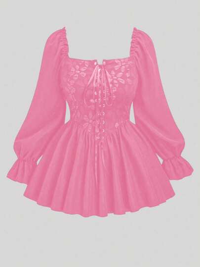 Flirla Blusa jacquard con mangas abullonadas, cuello y bajo acampanado, de talla grande - Rosa Pálido - Añade 1