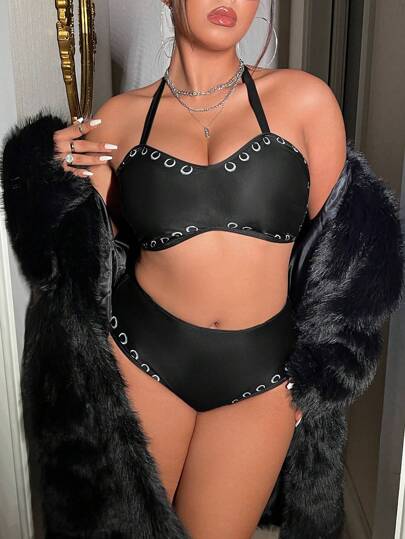 Swim EVENT Conjunto de bikini con argolla redonda de talla grande, para playa de verano - Negro - Añade 5