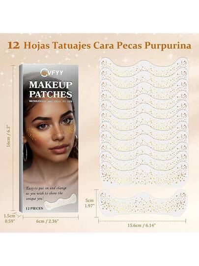 12 Piezas de Tatuajes Temporales de Pecas con Brillo Dorado, Impermeables y Resistentes al Agua para Mujeres, Adecuados para Festivales, Fiestas, Carnavales, Eventos Especiales (Dorado F) - Oro F - Añade 12