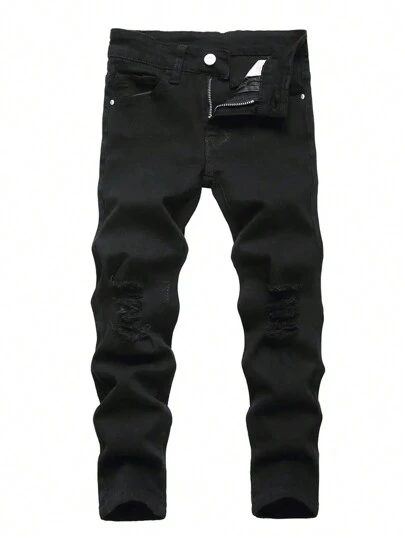 Vaqueros Sólidos Desgarrados Para Adolescentes - Negro - Añade 5