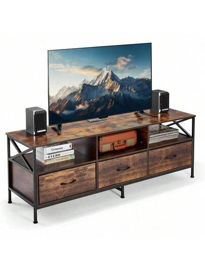 Mueble para TV Grande 147 CM, Mesa Con Regleta, Centro de Entretenimiento, Marco Metálico, 3 Cajones de Tela, para Salón, Dormitorio, 147*40*51 CM, Marrón - 1 - Añade 5