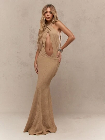 MISSGUIDED Vestido largo con cuello de halter, escote profundo, cola de sirena y espalda descubierta con textura - Albaricoque - Añade 1