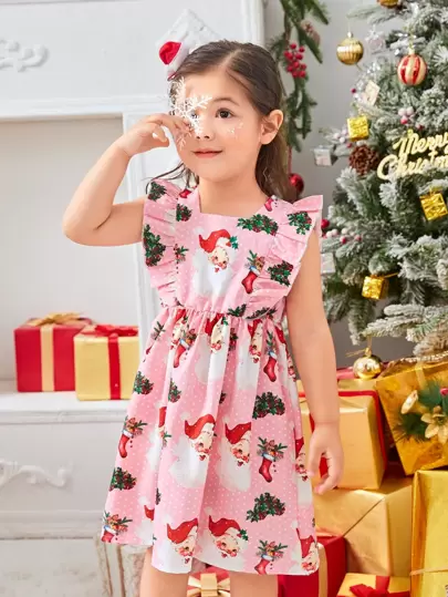 Niñas Vestido con estampado de Navidad ribete con fruncido - Rosa - Añade 4
