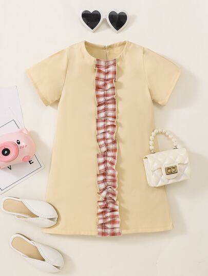 Niñas Vestido de cuadros ribete con fruncido de espalda con abertura de ojo - Albaricoque - Añade 5