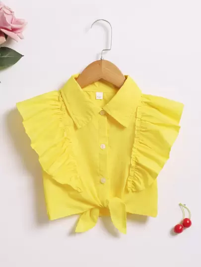 SHEIN Camisa Con Ribete De Volantes, Botones En La Parte Delantera Y Cintura Ajustada Con Lazo Par Jeune Fille - Amarillo - Añade 5