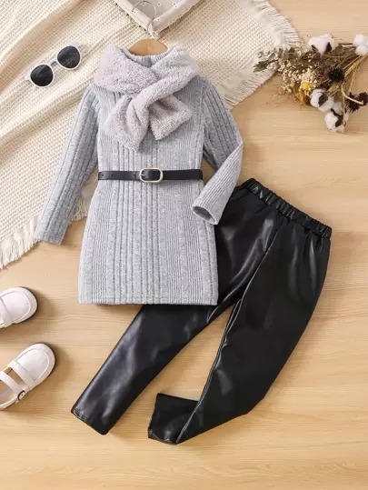 Niñitas Pullover unicolor tejido de canalé & Pantalones PU & Accesorio Pañuelo - Gris - Añade 3