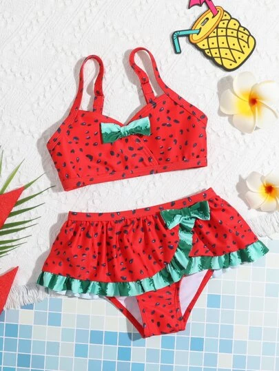 Conjunto de bikini con estampado de sandía y ribete de volantes para niña, ideal para playa de verano - Rojo - Añade 1