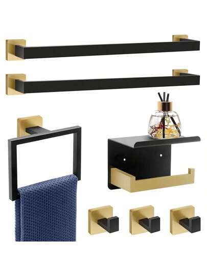 Dorudon atrox - Juego de 7 piezas de accesorios de baño de níquel cepillado con toallero, 2 barras cuadradas de 23 pulgadas y accesorios de baño de acero inoxidable para montaje en la pared - Negro y dorado - Añade 1
