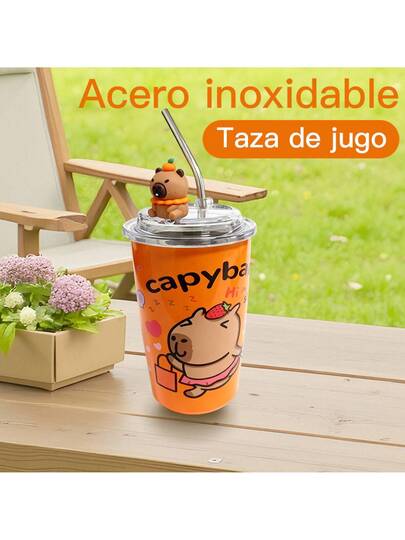 Vaso Capibara de Acero Inoxidable con Pajita y Tapa Transparente - Naranja - Carpincho Fresa - Añade 1