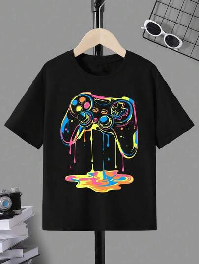 Camisetas impresas para niños de 4 a 16 años para niños y niñas A Boys'  Short-Sleeve ,A Boys' Short-Sleeve , featuring a vibrant neon game controller graphic (colorful drip-print on black fabric), super soft skin-friendly material with lightweight breathable function, trendy playful style, comfy for all-day wear-ideal for game nights, weekend hangouts, casual outings, or adding a cool, eye-catching touch to kids' daily outfits - Negro - Añade 1