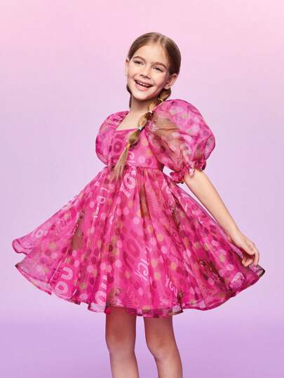 SCOOBY-DOO X SHEIN Vestido Con Cuello Cuadrado Y Mangas Abullonadas Para Niña Preadolescente Con Estampado De Dibujos Animados Y Letras - Multicolor - Añade 5