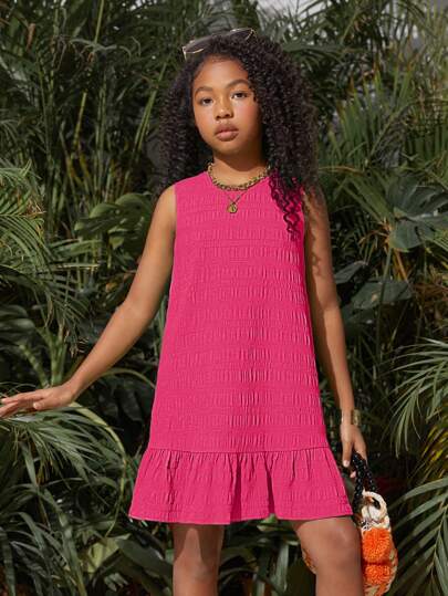SHEIN Vestido sin mangas con cuello redondo, de colores lisos y con volantes para niña preadolescente para días festivos/casual de primavera/verano - Rosa Fucsia - Añade 5