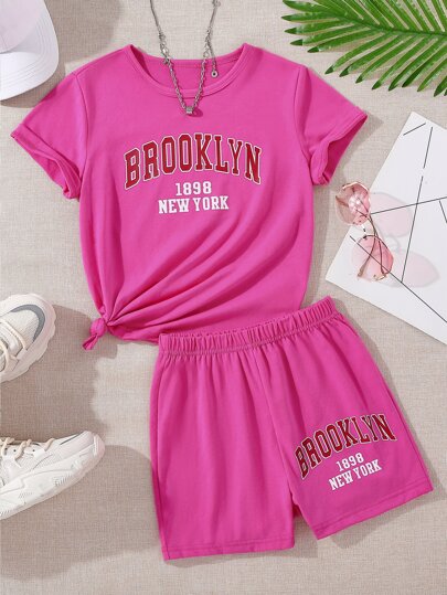 SHEIN Camisa Con Gráficos De Letras Y Pantaloncillos De Pista Para Niñas En Edad Intermedia - Rosa Fucsia - Añade 8