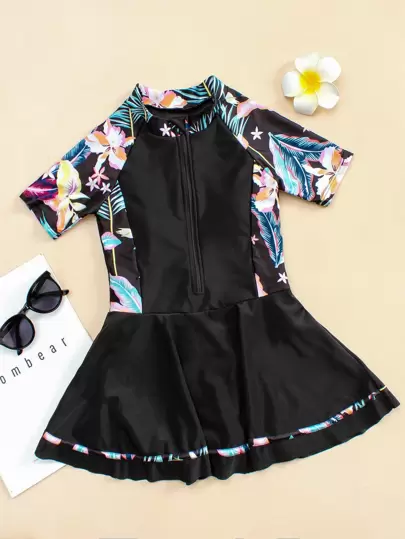 Traje De Baño De Una Pieza Con Cremallera Frontal Y Estampado Tropical Para Niña Tween - Multicolor - Añade 3