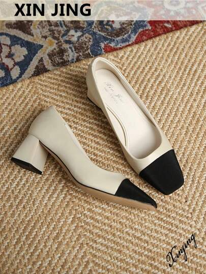 Xin Jing Shoes Zapatos de tacón de corte con tacón grueso de dos tonos para otoño/invierno, tacones altos elegantes de color block en color albaricoque para mujer, elegantes - Albaricoque - Añade 1
