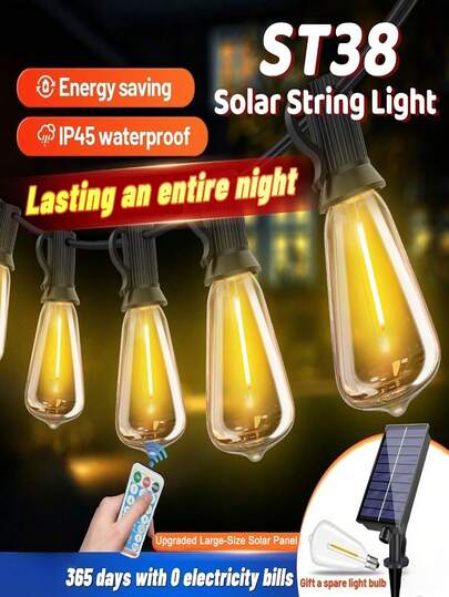 Panel solar de gran tamaño y alta eficiencia para cargar luces de cadena decorativas para el jardín 2200K de luz cálida suave, bombillas LED a prueba de golpes con control remoto y resistentes al agua para decoración colgante del patio - ST38 - Añade 2