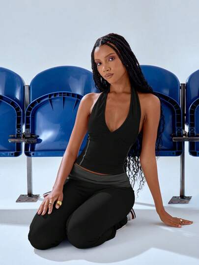 MUSERA Top halter con ribete, informal para aeropuerto, vacaciones, festival, vuelta al colegio, elegante - Negro - Añade 5