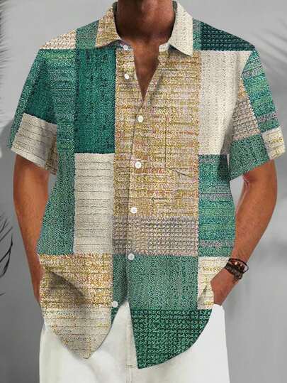 Camisa de manga corta con botones y bolsillos, de patrón geométrico vintage, para hombres de talla grande - Multicolor - Añade 6