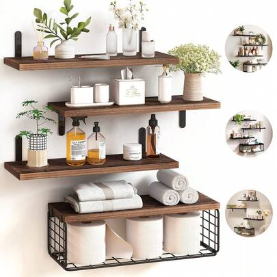 4 Repisas Flotante Madera Minimalista Muebles Hogar Decorar,Repisas Flotantes para Montaje en pared con Cestas de Almacenaje. Capacidad de Carga de 22libras,Estanterías de Moda y Duraderos para Organizador y Decorar Dormitorio, Sala y Oficina,Baño, Cocina. - Marrón - Añade 1