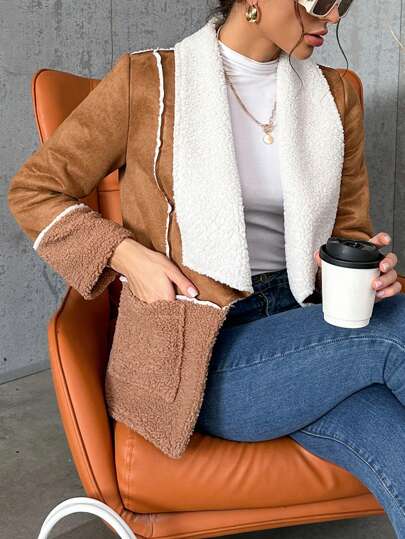 SHEIN Privé Abrigo de cuello cascada con forro teddy con parte delantera abierta - Café integral - Añade 1