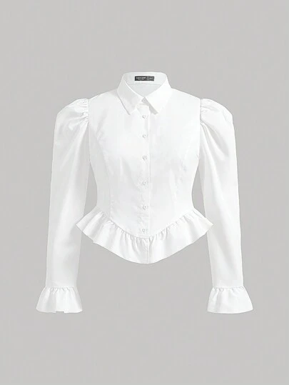 SHEIN MOD Blusa blanca de talla grande para mujer, con cuello en V, dobladillo con ribete de volantes, mangas abullonadas con ribetes y botones delanteros - Blanco - Añade 2