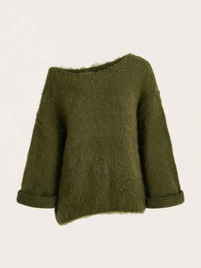 SHEIN LUNE Suéter de mujer de unicolor con cuello asimétrico, parte superior de manga larga de punto, suéter de otoño e invierno - Verde - Añade 1