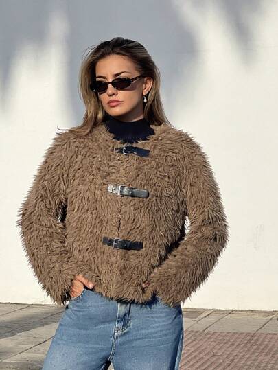 SHEIN Essnce Chaqueta larga de manga larga con botones delanteros esponjosa de unicolor, otoño e invierno para mujer - Marrón Mocha - Añade 2