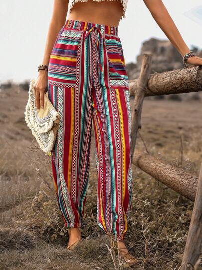 Breezaya Pantalones De Pierna Ancha De Cintura Con Cordón Y Estampado De Rayas Para Mujeres - Multicolor - Añade 1