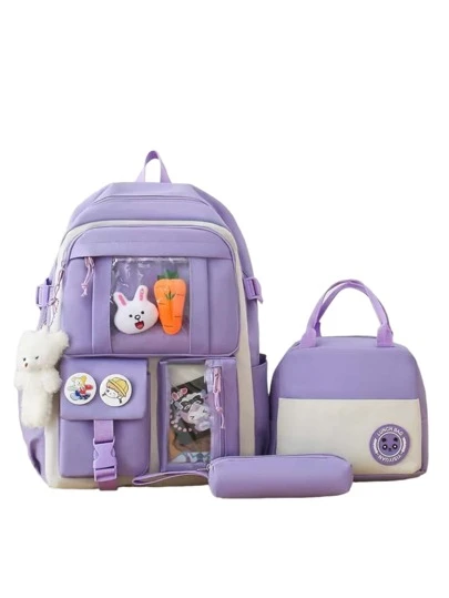 Mochila en set de 3 piezas con lonchera térmica impermeable tamaño escolar - Lila Púrpura - Añade 1